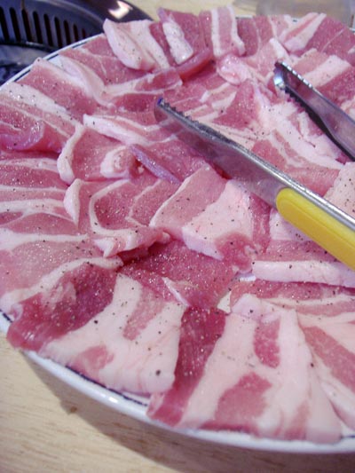 ずらっと並んだ「サムギョプサル」と呼ばれる豚バラ肉!