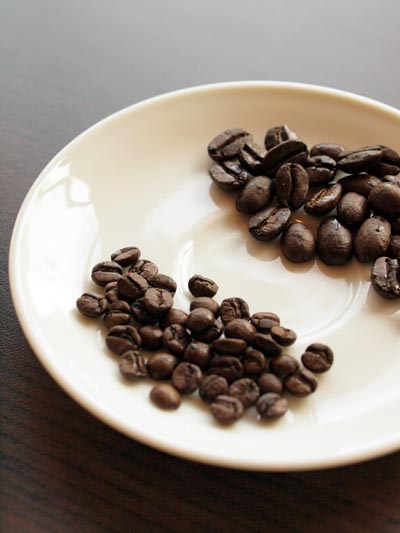 手前がマウイ・モカで、奥の大きめの粒が、コナエクストラファンシー。