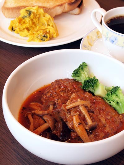 本当はね、初日はいろいろ大変だろうし、来週にでも行ってみようかな〜、と、思ってたんだけど、マスターの日記に「煮込みハンバーグ」の文字を発見!