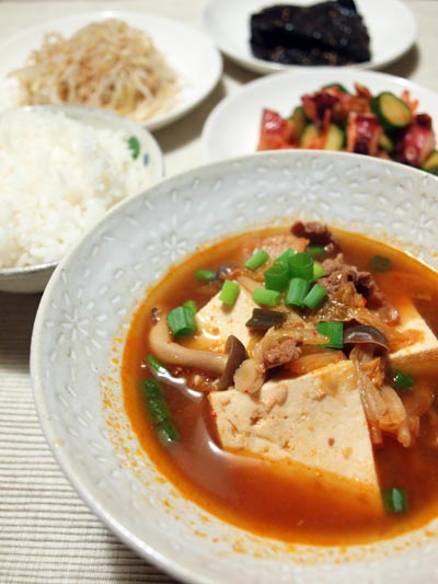 一番最初に、牛肉とキムチをゴマ油で炒め、水を入れてしばらくグツグツ煮て、アクを取ったら豆腐などの具と一緒に、調味料を入れてまた煮込む。