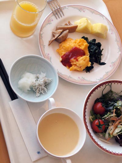 スクランブルエッグにホウレンソウソテー、海藻サラダにコーンポタージュ。