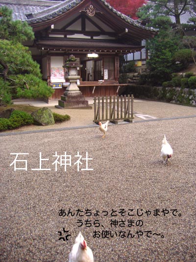 画像のは白いけど、キレイな色の尾の長い鶏もいて、雰囲気がやっぱり「神鶏」って感じよ!