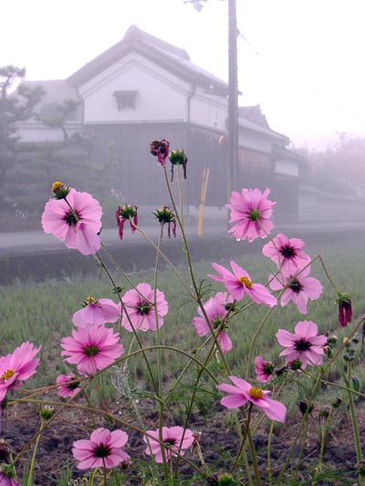 今は、咲き終わりのコスモスが静かに朝露に揺れている平和な風景だけ。