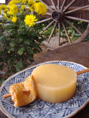景色が見えないので、迷いそうになるも、途中の民家がやっている茶店に湯気が上がった鍋が見えて、ついフラフラと近寄って「おでん」を買う。
