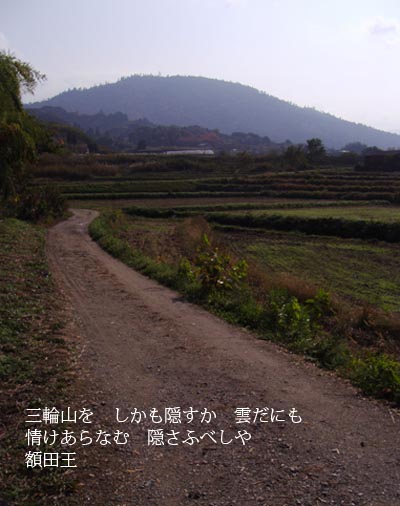飛鳥から、近江の都へ移る時にこの道を通り、後ろの三輪山を振り返り「懐かしい三輪山を、雲よ、どうぞ今は隠さないでおくれ」と、読んだのだそうでつ。(つまり私たちとは逆へ進んでたわけ)