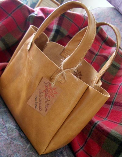 最初にダンナに作った皮のミニバッグは、もっと薄手の皮で、持ち手も一枚仕立て。