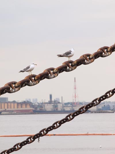 氷川丸の鎖で休憩してるカモメたちも「あ〜海風がキモチええの〜♪」なんて思ってるに違いない。