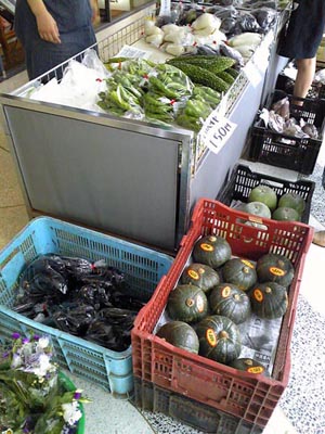 三浦の名物、スイカに冬瓜はもちろん、カボチャに茄子にシシトウ、ゴーヤにモロヘイヤなどなど、いろいろあったけど、1時近くだったので、もうだいぶ売れちゃってたなあ。