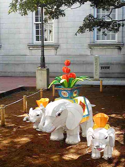開港資料館のたまぐすの木の根元に、象の親子のランタンが置いてあった。