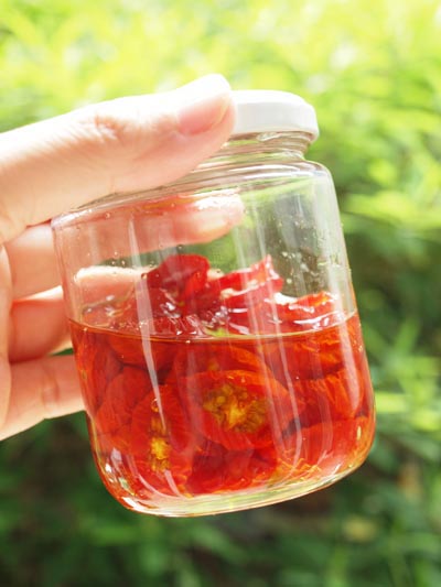 ザルに並べて風に当てて水分を飛ばし、瓶に入れてひたひたになるまでオリーブオイルを注ぐ。その際、バジルとニンニクのスライスと好みで唐辛子も入れる。という感じ。