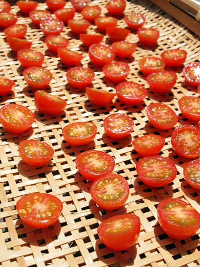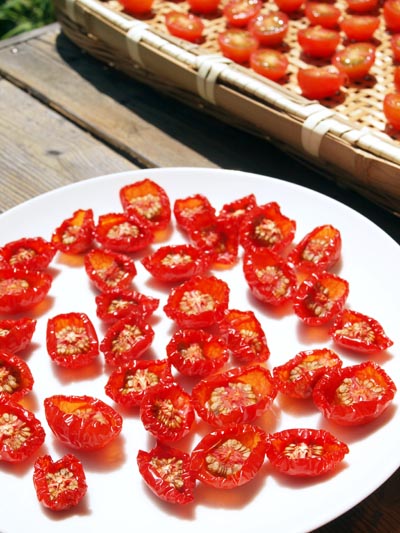 洗ったプチトマトを半分に切って、天日に干すだけ(笑)