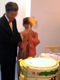 おふたりで割った樽酒で乾杯し、たくさんの御馳走を始め、おふたりで入刀したケーキをデザートにいただく。