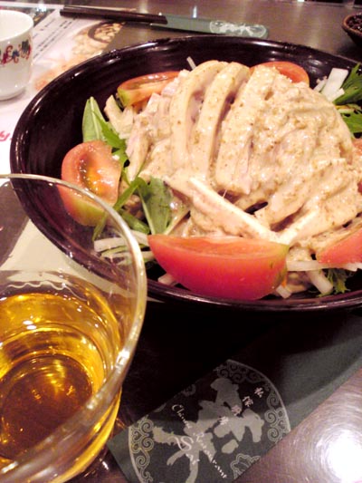 あまりの空腹に耐えきれず白切鶏沙拉(蒸し鶏のサラダ)を注文してつつく。