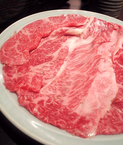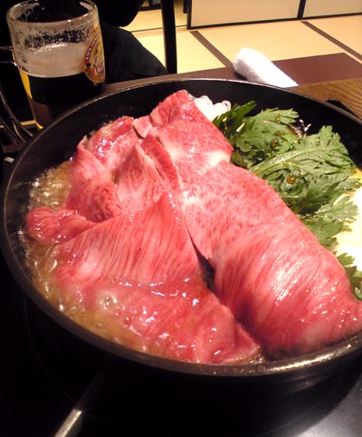 もちろんビールと、牛肉の刺身などツマミを何品か頼んで、牛鍋を待つ。
