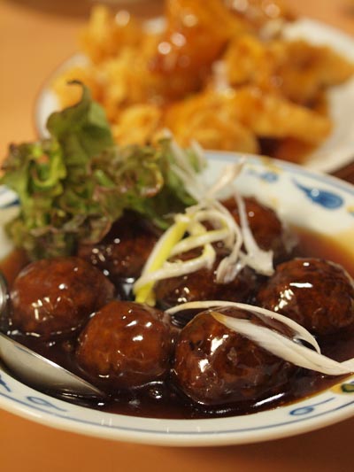 さみぃさんのダンナ様もいらしたので(と、イイワケに使ってごめんなさい)昼からビール飲みました!だってだって、ネギチャーシュウとか、揚げワンタンとか、鶏足とか、トマト入り肉団子とか、味も濃いめだし、ビールに合うものばっかりなんだもん!