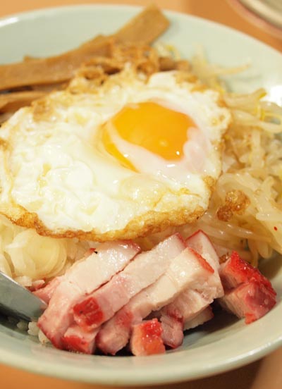 フツーなら、このまま端から食べ進んでしまうところなんだけど、さみぃさん曰く「よーっく混ぜて食べるのが正しい」とのこと。ほほう、ビビンパみたいだね!