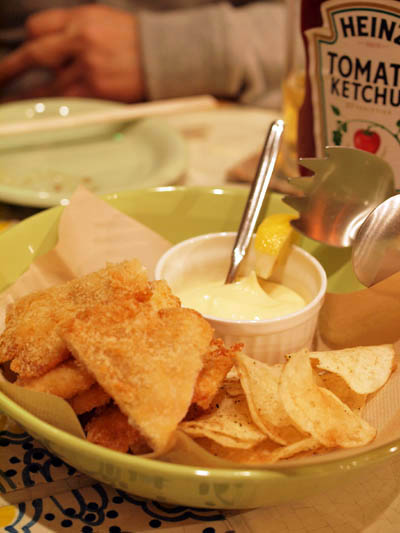 できたらフィッシュフライはワラジ大で、チップスはフレンチフライ希望よ。