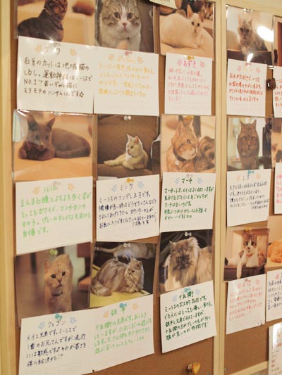 壁には、こうして「猫スタッフ」の写真と特徴を書いたものを貼ってくれてはいるのだけれど、ほぼ全員寝ていて、しかも丸まってたり、スンゴイかっこして寝てるもんだから、柄の判別どころか首に付けてる名札すらよく見えず・・・いったいダレがダレやら・・・f(^^;)