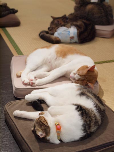 ましてお金出してまで、こういう所に来るのは、本気モードの猫好きさんばかりだろうし、そういうひとたちは寝てるのを起こしたりなどという無理なことをしないだろうから、にゃーたちは安心して寝てるんだろうね。