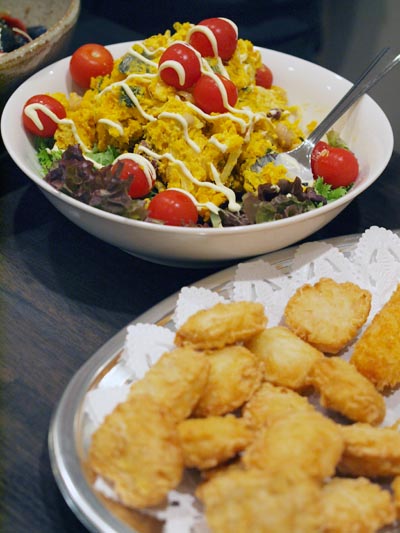 ちょっとピリ辛な、この炒めものは、お肉の代わりにマグロを使ってるんだって。