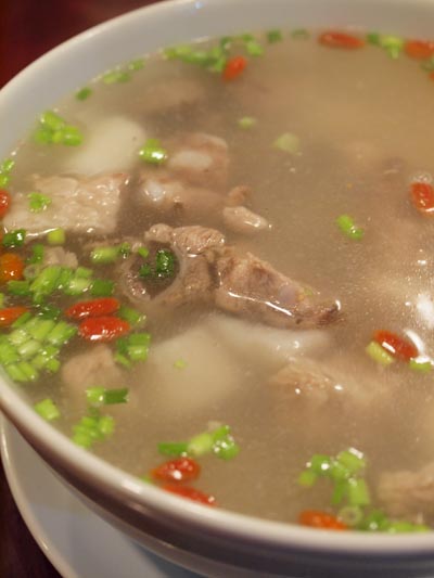 スープは、豚肉とキヌガサダケのブツ切りがたっぷり入ってた。