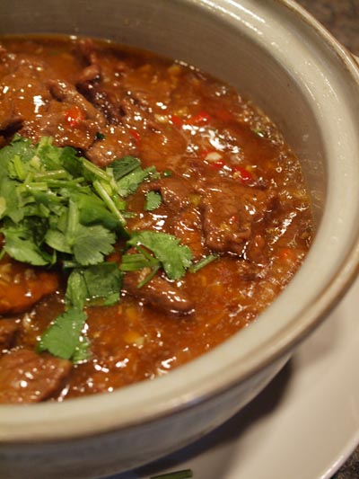 土鍋でどーんと出てきたのは、牛肉を沙茶醤で煮込んだもの。