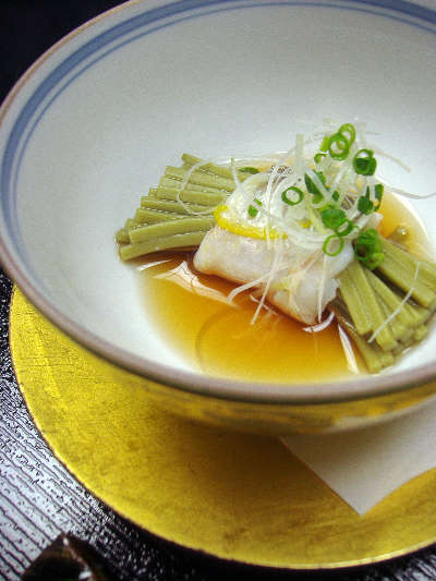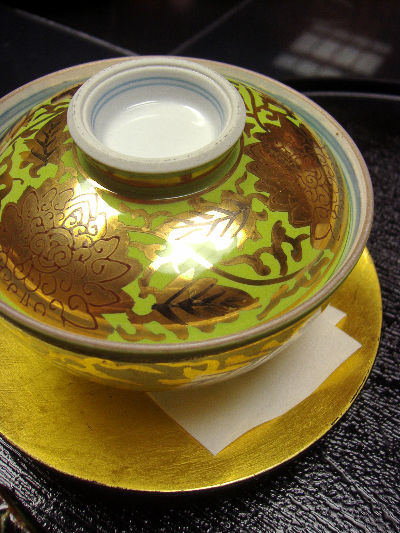 美しい金の器は、お蕎麦を甘鯛で巻いた信州蒸し。