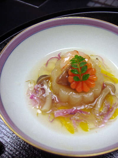 煮物は、花型に抜いた蕪をお出汁で煮て、その上にエビや合鴨、菊型の人参を乗せて、キノコや菊の花びら入りのあんをかけたもの。