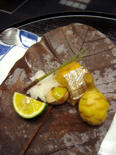 焼き物は朴の葉包み。開くと、太刀魚の巻織焼きと松ぼっくりをかたどったクワイ、大きなギンナンと菊花蕪の酢の物。クワイがほくほくでうまし!
