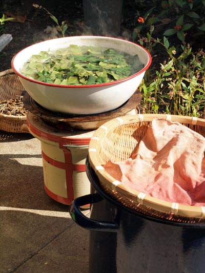 ビワの葉を刻んで、炭を起こした七輪で煮ては漉し、を繰り返して染液を作る。
