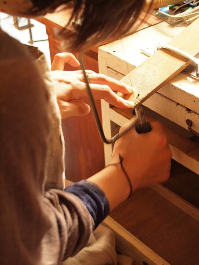 ラグの上に敷かれた大きな板の上が、作業台代わり。