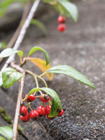 ツタ紅葉や、赤く熟したカラスウリなどの植物も、地味ながらちゃんと秋のお化粧してる。