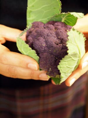 真ん中は紫色したブロッコリー☆パープル系のチェックのスカートのさばさんが持ってると、わざわざコーディネイトしたプチブーケみたい♪残念ながら、この紫色はアントシアニンという水溶性の色素なので、茹でると落ちてしまい、お湯が青くなるかわりに、ブロッコリーはフツーに緑色になっちゃうんだけどね。