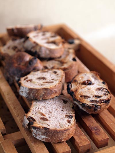 カレンツやクルミなどがぎっしり詰まったライ麦入りパンは、リエさんのお宅の近くのパン屋さんのもの。香ばしくあぶってくれたのがまたうまし♪