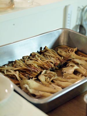 オープンキッチンの向こうから、きさくに「これは明日の分ね」と見せて下さったのは、下ごしらえを済ませてお出汁に浸かったキノコたち。