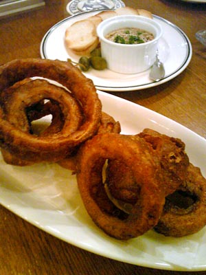とりあえず、自家製スモーク盛合せと、野菜のビール漬け、オニオンリングフライと、豚肉のリエットを注文。