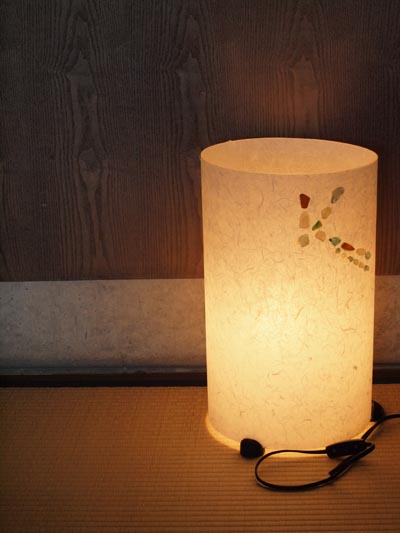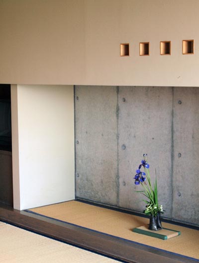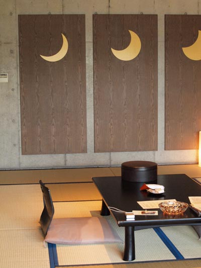 和室なんだけど、壁が打ちっぱなしのコンクリートで、月の満ち欠けを表した板が貼ってあったり、サンドグラスを使った和紙のランプとか。