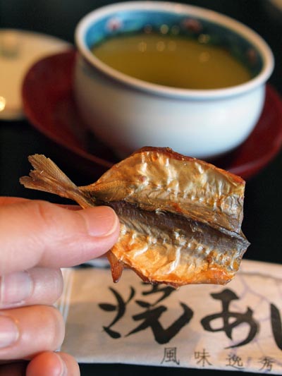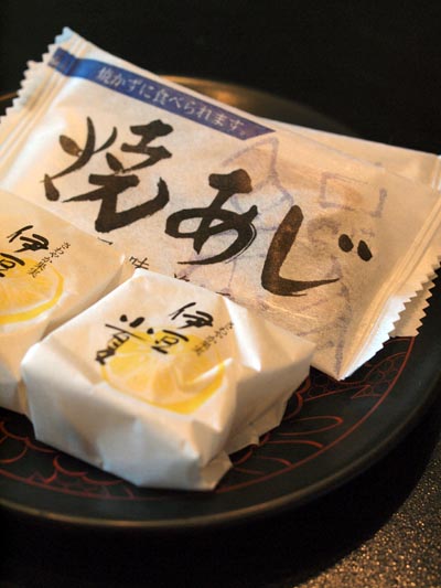 ちっちゃな鯵を、干物風にカリカリにしたものと、「伊豆小夏」というニューサマーオレンジの黄身時雨風お菓子。これ美味しかったなあ。