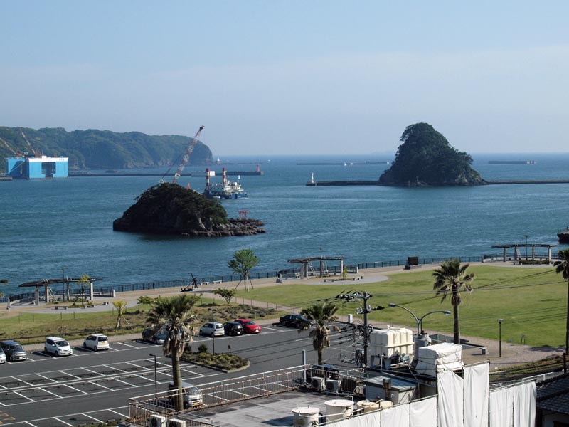 左の鳥居のあるのは「みさご島」、右の「犬走島」は、堤防があって歩いて渡れるようになってるみたい。手前は公園の駐車場。(クリックすると拡大されます↑)