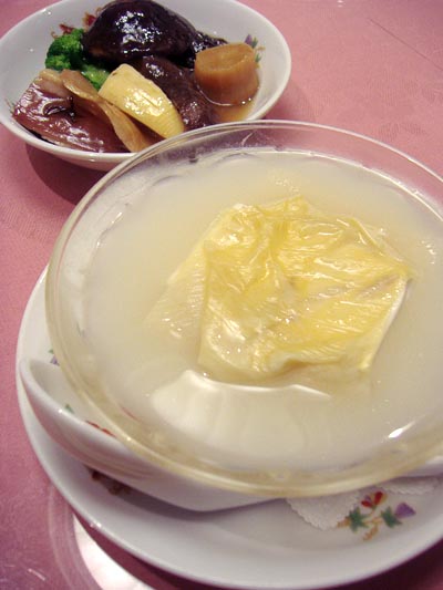 キヌガサダケと湯葉入りの、中華風湯豆腐って感じ?